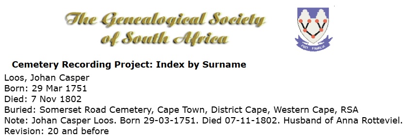 Johan Caspar-Casper LOOS-LOOTS born on 29 Mar 1751. He died on 7 Nov 1802 in Cape of Good Hope. He was buried in Somerset Rd Cemetery, Cape Town, Cape of Good Hope.