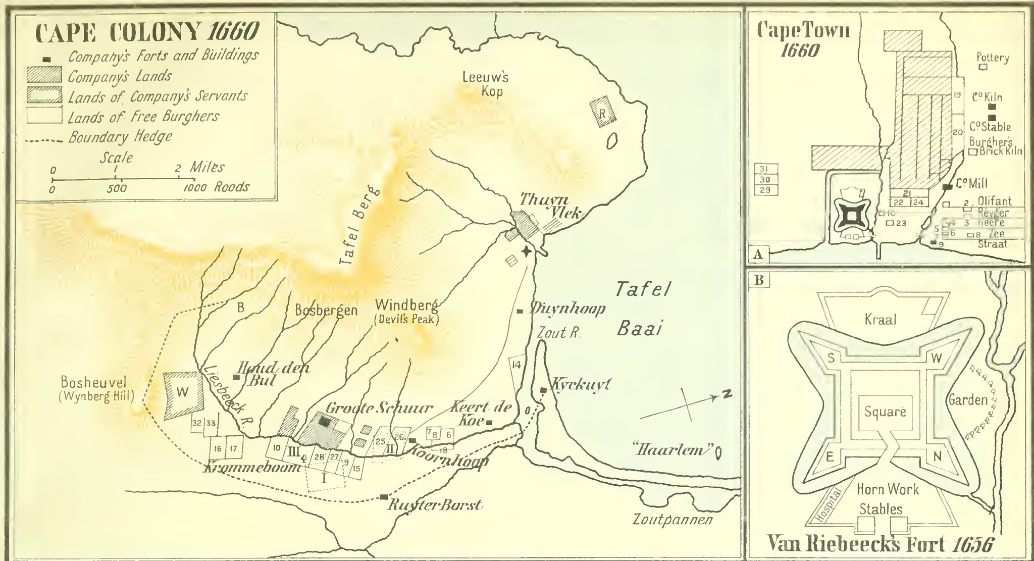 On the same day that the ship docked in Table Bay, Pieter received his vrijbrief on request from the Commander Jan Van Riebeeck. Pieter was granted his vrijburger status notwithstanding still being under contract with the VOC for another 5 years. His contact was altered, and he was going to be relieved from his contractual duties to the VOC if he agreed to work as a servant to Thielman Hindricx from Utrecht from the same period, being 5 years, or any other existing vrijburger that might require his services. Pieter agreed to the new conditions, and he received his vrijbrief on 18 January 1662 and started his employed at Thielman Hindricx. Thielan Hendricks was working as an agriculturist on the Jan Van Riebeeck’s farm Uijtwijck and had already been provided with one Dutch servant, Jan Verhagen from Arendonck. The farm Uijtwijck was located near the present day Green Point area as depicted in the map location “R”. The other farm Bosheuwel (located at marker “W”) was farmed by Barent Waenders from Barick.